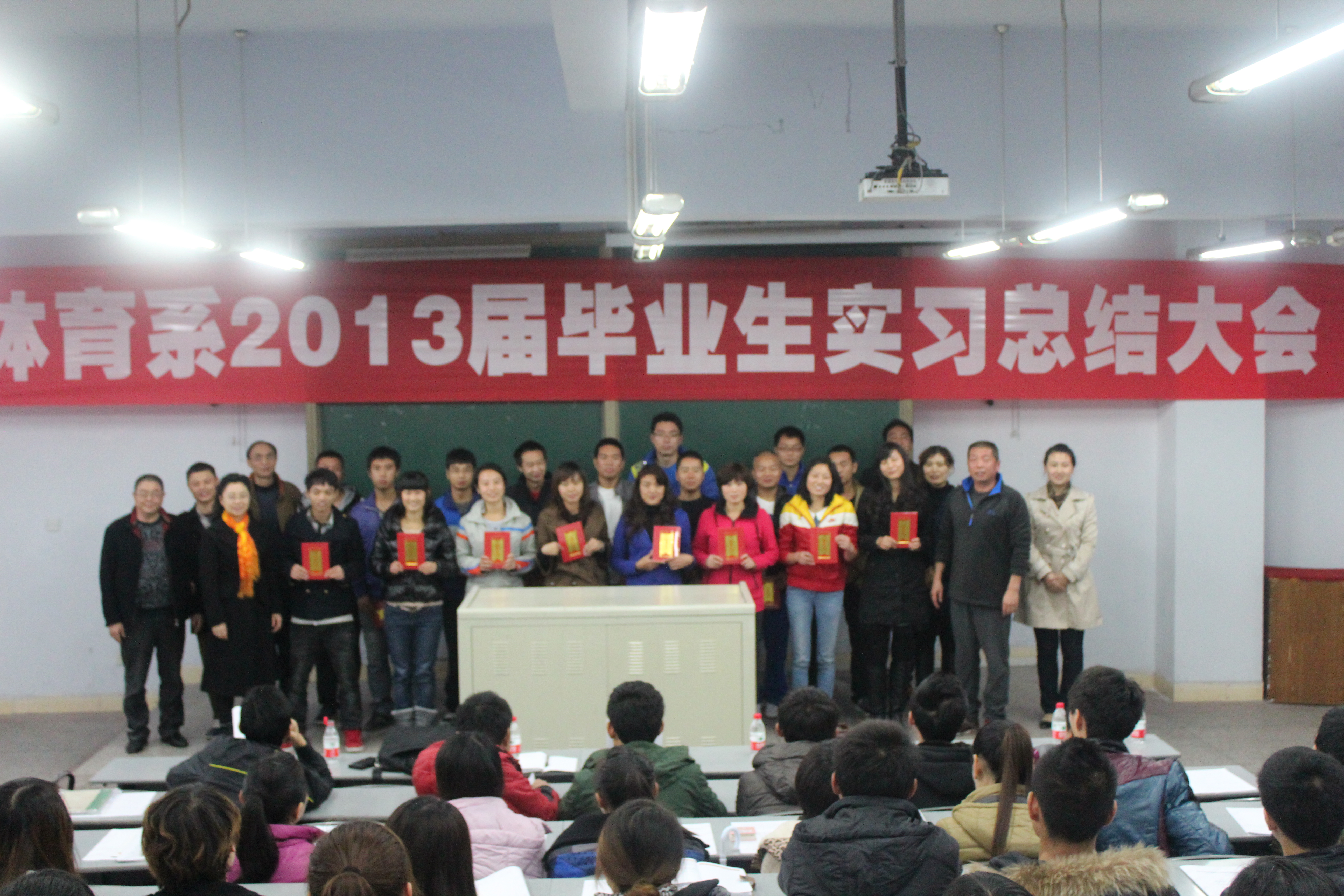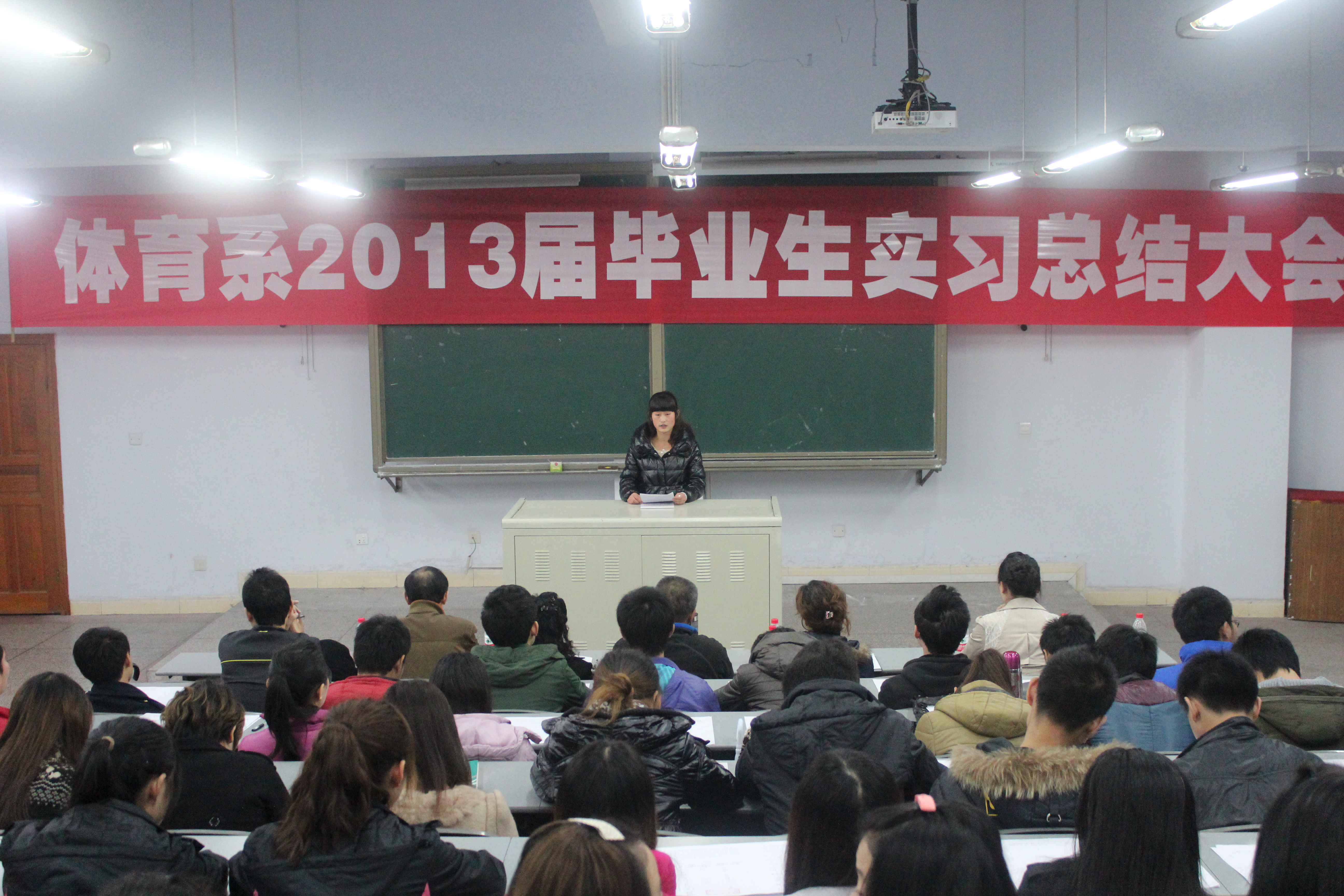 2012年11月15日下午4:30,英国上市公司官网365体育系2013届毕业生在莲湖校区教学楼125教室举行实习总结大会。此次大会由何其波同学主持,参加此次大会的有教务处曹科长、体育系主任董立教授、体育系副主任陈碧述教授、体育系李文华老师、体育系团总支书记兼辅导员李霞老师、体育系辅导员那明明老师,以及体育系2013届的全体毕业生。