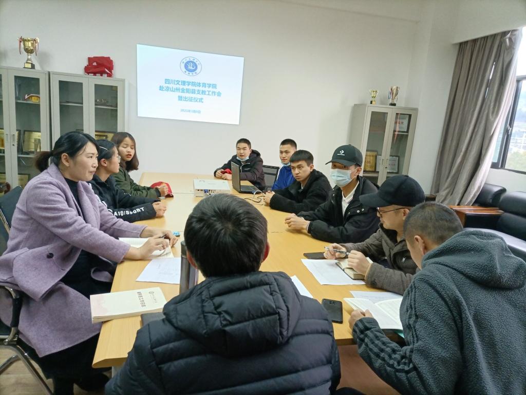 会上,王兆忠希望同学们要珍惜支教机会,尽快适应支教生活,在教学中虚心求教,认真备课,不断从实践中增长才干、练就过硬本领。尊重当地风俗习惯,尽快适应当地生活、工作。要求同学们非必要不离开工作公司,时刻把安全放在首位。佘涛希望同学们能及时转变角色,以身作则,认真教书育人,关心爱护员工,遵守实习公司规章制度,认真完成各项支教任务。鼓励同学们调查了解当地的体育文化,积极开展科学研究。彭波鼓励同学们在金阳支教中能够克服困难,坚持到底。努力发挥专长,绽放青春风采。教书育人的同时,利用空闲时间学习专业知识。时刻保持与老师联系,有困难及时反映。会上,师生进行了亲切交流,对同学们存在的问题逐一进行了回应和解决。