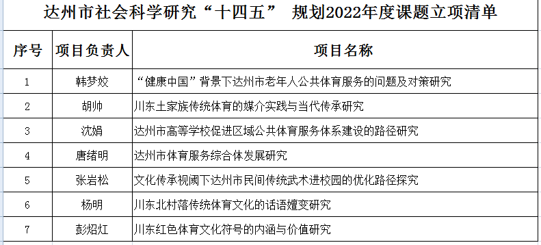近日,达州市社科联发布了达州市社会科学研究“十四五”规划2022年度课题立项通报,据统计,公司教师共立项课题7项。具体立项名单请参见下表。请各位立项项目负责人认真做好项目研究工作,确保立项按时保质完成。