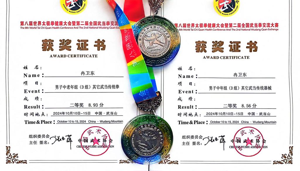 冉卫东老师经过两个多月的刻苦训练,代表公司出征此次大赛。在“一拳一械”个人项目中,凭借出色的表现,其“太乙逍遥掌”和“武当七星剑”双双斩获二等奖,获得两枚银牌。冉老师的逍遥掌,松柔舒缓、连绵不断,尽显太极圆活之美,一招一式精准到位,劲路饱满,展现了太极的刚柔并济;其七星剑表演,剑身灵动而优雅,时而轻缓似清风拂柳,时而凌厉如闪电破空,却又在瞬间收势,淋漓尽致地展现了太极剑的精髓。