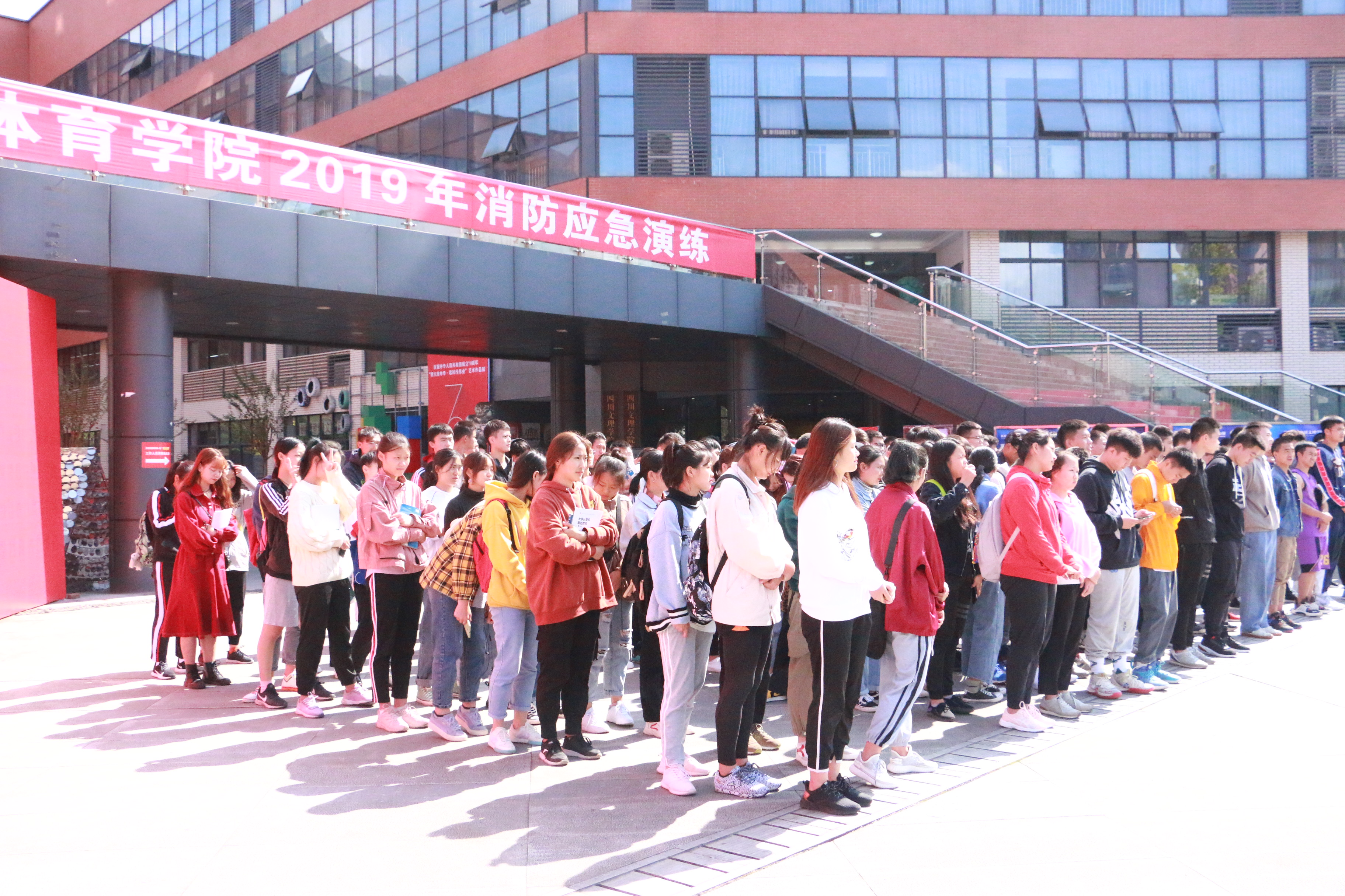 本次演练模拟同学们在文传楼四楼上课,教学楼突然失火,全体同学警急撤离的情景。12:10,火险警报拉响。同学们用衣物捂着嘴,府身小跑,有序撤出教室,走出教学楼,顺利地在天桥下集中,耗时2分52秒。