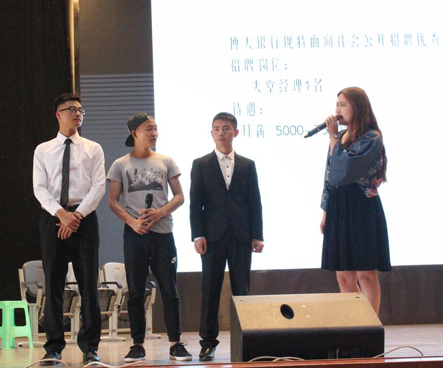 闭幕式上先进行的是职场竞聘观摩活动,X银行招聘大堂经理和Y私立中公司招聘体育教师的面试环节,三名同学模拟招聘面试考官,四名同学进行面试。同学们递交简历后,依次进入面试环节。面试后,由同学们发现问题,指出每名面试者表现好的方面与不足,此外还对应该怎样面试进行了深入交流与讨论。讨论后,那老师对面试者们做点评,并从简历的制作,面试前的准备给了同学们一些建议。
