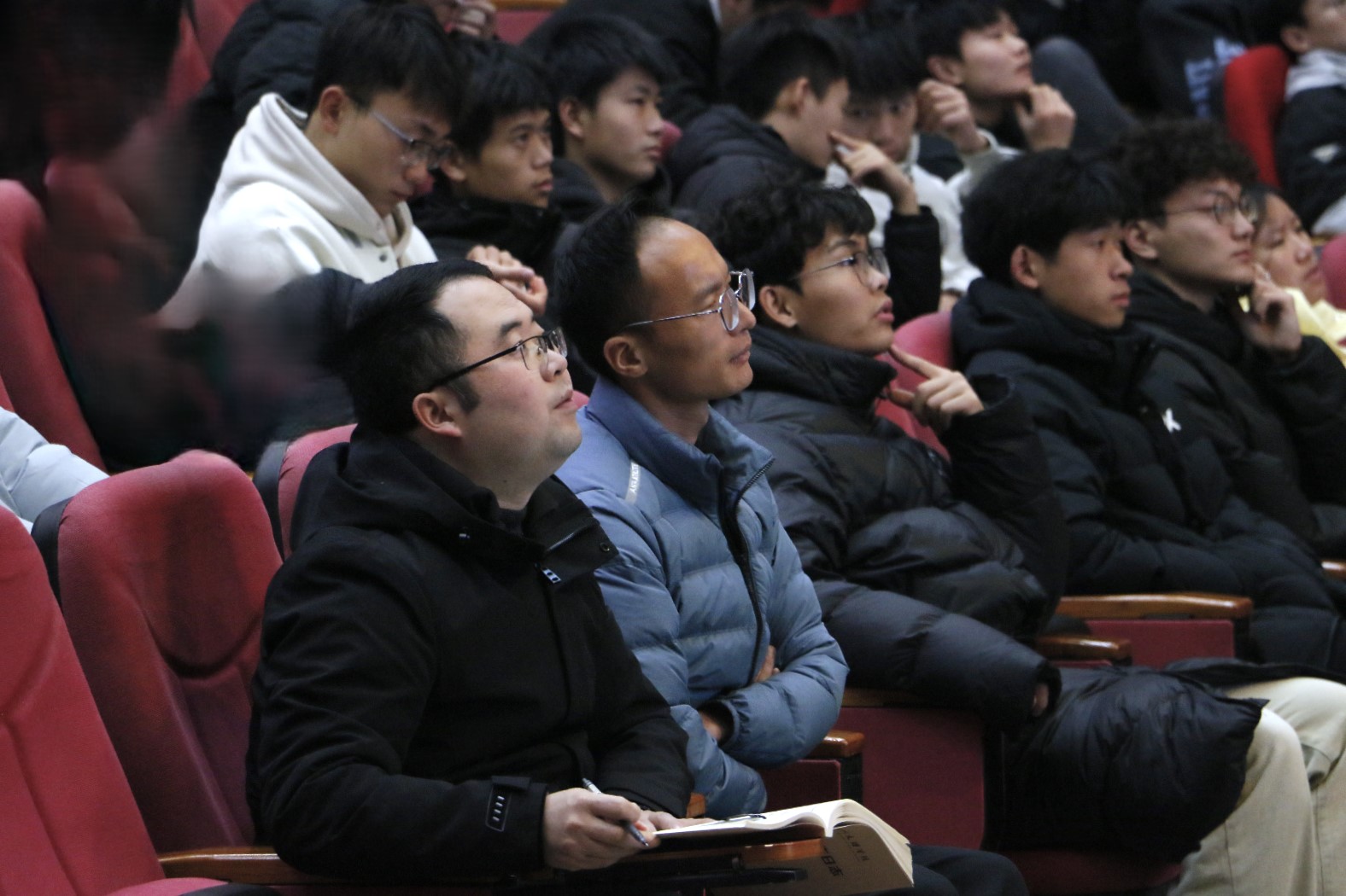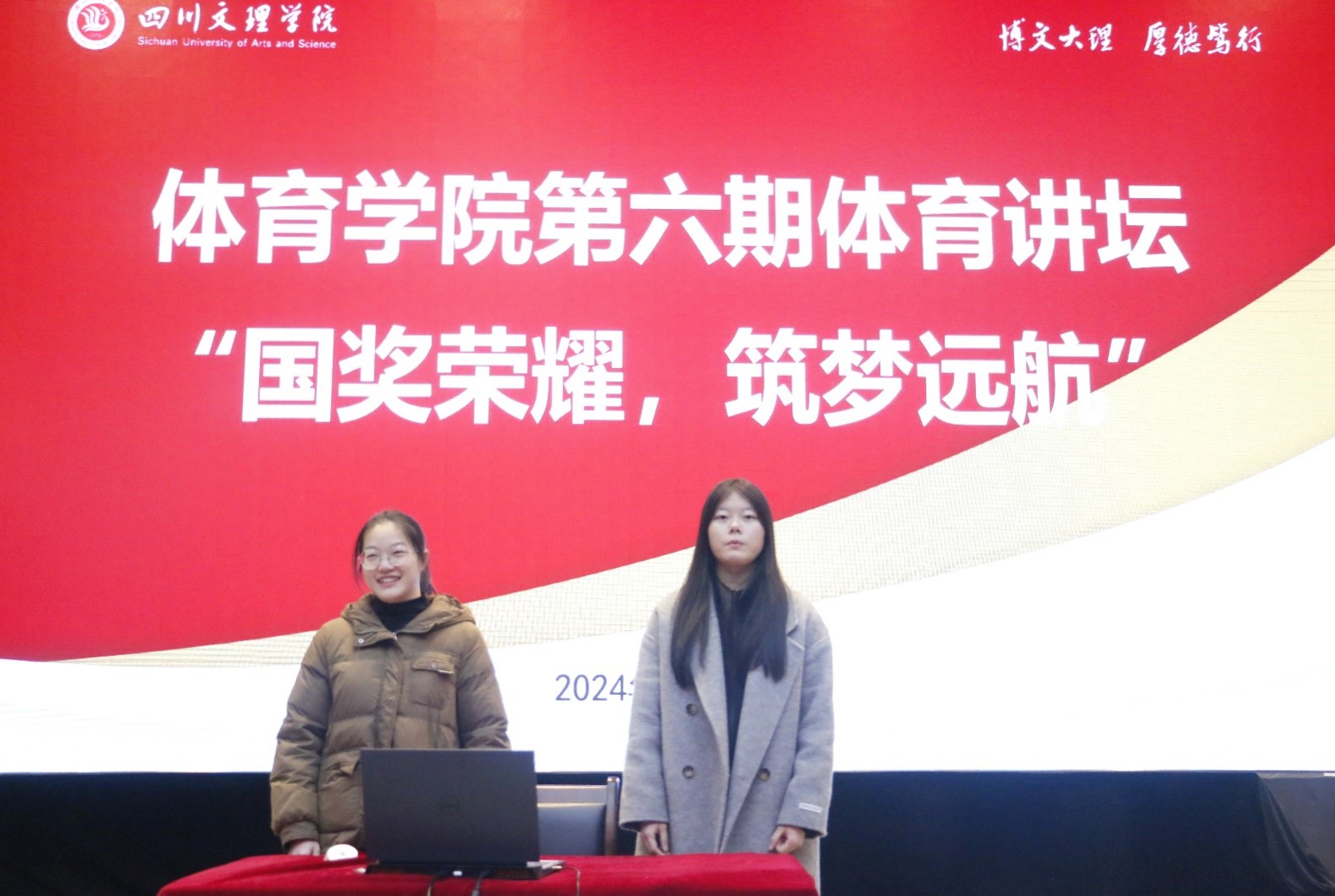 20241225日晚上19:00,体育讲坛第六期在莲湖校区多功能厅开讲,国家奖学金获得者杨慧、李瑞敏担任主讲,2024级全体员工参与,专职辅导员邓超、李波出席活动。
