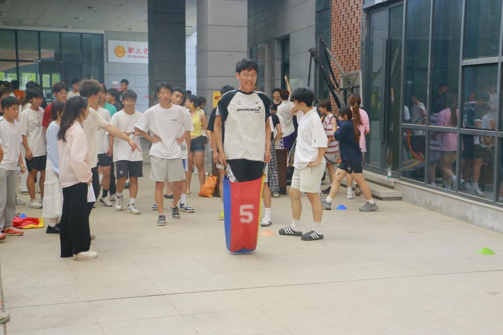 其中,极限逃生要求10人一组协同完成多项障碍挑战,充分考验团队之间的协作与沟通;跳绳接力则强调默契配合,队员之间动作连贯,节奏一致;袋鼠跳项目趣味十足,参赛者身着道具蹦跳前行,现场笑声不断。与此同时,行走呼啦圈翻山越岭作为个人项目,同样吸引了大量同学积极参与,大家在跳跃、穿越、奔跑的过程中释放积压情绪,舒缓心理压力。